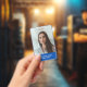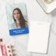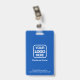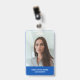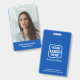 Modernes, einfaches und berufliches Abzeichen von Geschäftsangestellten auf blauem Hintergrund mit weißer Typografie, um Ihrem individuellen Logo zu entsprechen, mit dem Foto des Mitarbeiters und dem beruflichen Titel oder der Abteilung auf der Vorderseite und dem Business Logo sowie weiteren Informationen im Hintergrund.