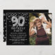 Moderne Schwarz-Silber-Überraschung Geburtstagsfeier Einladung für jemanden, der 90 Jahre alt ist! Mit einem schwarzen Hintergrund, einem Foto des Geburtstags Mann/Frau, Imitate silberne Glitzer Konfetti, silberne 90. Geburtstagsballons und einer eleganten Geburtstagsvorlage, die leicht anzupassen ist.