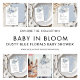 Modernes Blue Florals Script Baby in Blütendusche. Elegante Blumen in sommerlich hellblau sind oben. Baby in Bloom ist in einem Set-Handschrift-Stil Skript. Personalisieren Sie die Erholung des Textes einfach auf Ihre eigenen Daten.