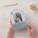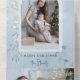 Elegantes, modernes Urlaubsprojekt mit dem Foto "Keepake" in Form eines bogenförmigen Ausschnittes mit undurchsichtigem, weißem Rahmen, abstraktem Aquarell, hellblau-weißem Wintergrün und Glitzern mit weißem Schnee auf pastellblauen Aquarellfarben. Enthält bearbeitbare Textfelder und Bildvorlagen auf Vorder- und Paneelen.