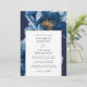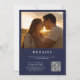 Diese elegante marineblaue und goldbläuliche Hochzeitseinladung kann mit Ihren Informationen in der modernen Typografie und Ihren Hochzeitsdetails auf der Rückseite personalisiert werden, zusammen mit Ihrem Hochzeitswebsite QR-Code und speziellem Foto. Entwickelt von Thisisnotme©