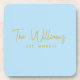 Vollständig anpassbare, moderne hellblaue Getränkekopfer, die sich ideal für ein Brautparty, eine Verlobung oder ein Hauswärmeschenk eignen. Mit einem blassblauen Hintergrund, einem modernen, handgeschriebenen Schriftart im Stile eines Drehbuchs in Goldton und einem feststehenden Datum, um den Anlass zu markieren. Korkunterlage schützt Möbel vor Nassmarken. Geben Sie Ihren Namen und das Jahr, das Sie verheiratet got haben! Großes Memento für Braut und Bräutigam.