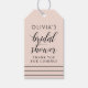 Modernes und schicke, rosafarbene Hochzeitsstiftung Brautparty, danke Ihnen, dass die Tags ein stilvolles schwarzes typografisches Design mit fett kalligraphischen Skripten und gestreiften Akzenten und eleganten, benutzerdefinierten Text, der mit dem Namen der Braut personalisiert werden kann und ein Dankeschön-Nachricht.