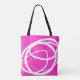 Diese coole Boho Tote-Tasche zeichnet sich durch ein einfaches und gleichzeitig attraktives Design aus. Sie besteht aus einer spielenden weißen Linie, die auf jeder Seite einen anderen zeichnete: die eine ist sehr fein in kreisförmigen Formen und die andere ist dicker und erzeugt ein unregelmäßiges ausdrucksstarkes Dreieck. Der Hintergrund ist Fuchsia.