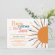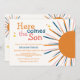 Niedliches farbiges Retro "Hier kommt der Sohn" Baby Dusche Einladung, Design-Funktion mit farbenfrohen Sonnenstrahlen mit farbenfrohen marineblauen blau, orange, rosa Typografie " Here Comes The Son". Ideal für Baby Baby Dusche Sonnenschein Thema. Sie können Text und Farbe anpassen.