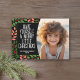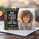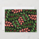 Modernes Design für eine Urlaubsfotokarte. Front - Ein schlichter Bogen grenzt an das Foto mit Korallen, grünem und schwarzem Hintergrund und einem großen Schriftart Holiday Gruß. Im Hintergrund sind botanische Blätter enthalten. Zurück - Ein modernes botanisches Muster mit Blätter und Beeren.