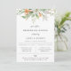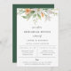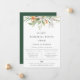 Elegante Aquarellblütenanordnung aus Elfenbein-Weiß, Pachelorange und zarte grüne Lilien und Blätter, Probe Dinner Einladung. Chic und modernes typografisches Design. Die Rückseite der Karte weist eine solide, dunkelgrüne Smaragdgrün-Farbe auf.