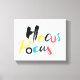 Modernes, spielerisches, farbenfrohes Grafikdesign eines Sprichworts "Hocus Pocus" in Rot, Gelb, Blau und Schwarz. Kreative, experimentelle, fröhliche Typografie.