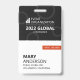 Ein modernes Abzeichen für Geschäftstreffen. Das Design zeigt den Namen der Organisation, die die Veranstaltung leitet, und den Veranstaltungsnamen in der oberen Hälfte. In der unteren Hälfte des Abzeichens werden der Name, die geschäftliche und die Veranstaltungsrolle des Teilnehmers angezeigt. Dieses Business Event Abzeichen eignet sich ideal für Seminare, Jahresforen, globale Tagungen, Konferenzen oder Messen.