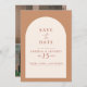 Senden Sie Ihre Verlobung Ankündigungen im Stil mit diesem modernen karamellfarbenen, neutralen, Terrakotta Bogen Form Hochzeit Save the Date, mit Ihrem Lieblings-Verlobung-Foto auf der Rückseite. Copyright Anastasia Designs, alle Rechte vorbehalten.