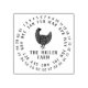 Runde Briefmarke mit den Tagen des Monats und der Monate des Jahres in fett formatierter Typografie. Mitten in der Briefmarke gibt es eine moderne Hühnerdarstellung und darunter Ihren Familiennamen. Diese Briefmarke sind für frische Produkte, können Sie umrunden das Datum! Sehen Sie sich den Sammlungs-Link auf dieser Seite an oder besuchen Sie unseren Laden für mehr Bürobedarf für Bauernhäuser!