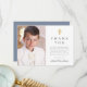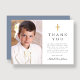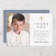 Modern Dusty Blue Cross Boy First Communion Foto Danke Karte.