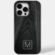 Eleganter iPhone-Gehäuse mit dem Monogramm-Initial in einem quadratischen, weißen Rahmen auf einem schwarzen Holzkornhintergrund.