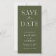 Mit dieser stilvollen, modernen Foto Save the Date-Karte verkünden Sie Ihr Hochzeitstag. Das Design zeigt "Save the Date" auf der Vorderseite in weißen Serifen und Skript-Schriftart mit einem olivgrünen Hintergrund. Personalisieren Sie die minimalistische Ankündigung Datum freihalten, indem Sie Namen, Datum und Hochzeitsort hinzufügen. Die Karte kehrt um, um Ihr Lieblings-Verlobung-Foto anzuzeigen. Die Ankündigung Datum freihalten ist perfekt für jedes Hochzeitsthema.