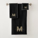 Personalisierte Benutzerdefiniert Erstellen Sie Ihr eigenes Black Gold und White Initial Name Monogram Badetuch Set. Fügen Sie Ihrem Bad eine Touch von Luxus und Glamour mit diesem stilvollen Badetuch-Set hinzu. Dieses Set beinhaltet ein Badetuch, Handtuch und Waschlappen, jedes mit einem fett goldfarbenen Anfangsstift und einem fließenden weißen Schriftzeichen-Monogramm in der unteren rechten Ecke. Bitte beachten Sie, dass das Gold eine flache Farbe ohne Schimmer oder metallische Oberfläche ist, die einen raffinierten und modernen Look bietet. Diese Handtücher sind perfekt für den dekorativen und funktionellen Gebrauch konzipiert und machen sie zu einem glamourösen Geschenk für Geburtstage, Hauswärme, Ferien, Hochzeiten oder besondere Anlässe. Sie sind auch eine hervorragende Wahl für Unis, die ins Studentenwohnheim gehen oder zum ersten Mal ausziehen. Dieses mit Monogramm Handtuchhandtuch-Set fügt jedem Zuhause eine elegante und praktische Touch hinzu.