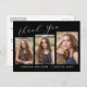 Diese moderne, elegante 3-Foto-Abschluss-Postkarte "Danke" mit Designelementen moderner Texte, die mit eleganter Kalligraphie-Schrift verschmolzen sind. Ihre Fotos werden auf der Vorderseite der Karte angezeigt, während die Rückseite der Karte personalisierten Textraum für eine Dankeschön-Nachricht bietet oder leer verlassen werden kann, wenn Sie Ihre Nachricht handschreiben möchten. Die Hintergründe sind in Schwarz und Weiß gehalten oder können einfach an die gewünschten Farben angepasst werden.