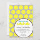 Modernes Ikat inspirierte Muster mit grauem Hintergrund und hellen gelben Kreisen. Ihre Partyinformationen geschrieben in extravaganten, modernen Schriftart. Sehr girly und bunt