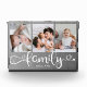 Moderner, benutzerdefinierter Collage-Block mit Platz für 3 Fotos rund um ein trendy Wirbles Skript lesen FAMILY und Ihr individuelle Name unten. Das ist die Bauernversion mit grauem Leinenverschluss.