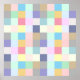 Es handelt sich um ein trendiges und stilvolles Design mit mehrfarbigen Quadraten, die in einem karierten Muster auf einem neutralen Gitterhintergrund angeordnet sind. Die Quadrate sind in verschiedenen Farben wie Blau, Grün, Rosa, lila, Gelb, Grau, Orange und Regenbogenpastelltönen gehalten und bilden ein einzigartiges geometrisches Schachbrettmuster.