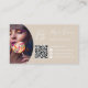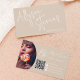 Eine moderne und fett-schminkende Makeup-Künstlerin und Friseur-Visitenkarte mit übergroßen Namen an der Vorderseite in handgeschriebenem Stil Schriftart und Foto, qr-Code und Social Media auf der Rückseite auf Beige. Alle Farben sind bearbeitbar.
