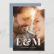 Moderne staubblaue Hochzeiten speichern die Datumsanzeige mit Ihrem Foto, überlagert mit Ihren Monogramm-Initialen in großer, kühner und eleganter weißer Typografie. Personalisieren Sie Ihre Save the Date Details auf dem Rücken in der einfachen weißen Typografie.