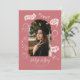 Feiern Sie Ihre Errungenschaft mit dieser stilvollen Abschluss-Ankündigung mit einem Foto und spielerisch von Hand gezeichnet Doodles. Rosa rot.