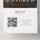 Ein modernes Overlay mit großen Namen und ein komplettes Foto sind die Funktionen, die sich hier in einer Hochzeitseinladung mit einer Antwortkarte mit QR Code RSVP Card und der Hochzeitswebseite ergeben.