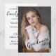 Feiern Sie mit uns den Abschluss von [Ihr Name hier]! Diese elegante und individuell gestaltbare Einladung bietet Ihnen die Möglichkeit, das Foto durch ein eigenes zu ersetzen und so einzigartig persönlich zu gestalten. Das stilvolle Design beinhaltet den Text "Graduate 20XX", der in einem eleganten Drehbuch geschrieben ist und perfekt zum Gedenken an diesen besonderen Meilenstein geeignet ist. Zusätzliche Informationen über das Ereignis werden auf der Rückseite gedruckt, sodass alle Details abgedeckt sind. Egal ob Sie ein Party hosten oder einfach nur wollte, um die freudigen Neuigkeiten zu teilen, diese Einladung wird bestimmt beeindrucken.
