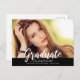 Diese stilvolle, moderne Graduiertenparty Postcard Einladung beinhaltet ein Foto mit einem weißen Skriptüberlagerungsstück "Graduate" und einem schwarzen Bannerhintergrund. Personalisieren Sie den modernen, individuellen Text mit dem Namen, der Schule und dem geschlossen Jahr Ihres Abschlusses. Die Formulierung der Graduierungspartei ist auf der Rückseite zu finden.