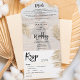 Moderne tropische Hochzeitsfeier mit schwarzen und goldenen Palmen in einer Einladung, mit Details Haupt-Einladung und uAwg , mit goldgeflochtenen Palmenblättern und elegantem Drehbuch. Foto hinzufügen