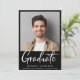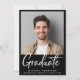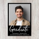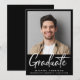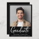 Moderne Ankündigung des Schwarzen Abschlusses mit dem Foto des Absolventen und "Graduate" in einer zeitgenössischen fett-weißen Schrift. Fügen Sie ihren Namen, das Klassenjahr und die Schule in der einfachen weißen Typografie.
