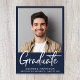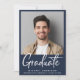 Moderne blaue Abschluss-Ankündigung mit dem Foto des Absolventen, "Graduate" in einer kühlen zeitgenössischen weißen Schrift und ihren Namen, Klassenjahr und Schule in schlicht weißer Typografie.