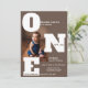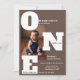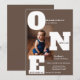 Eine moderne und kühne Einladung zum ersten Geburtstag in einem reichen mochafarbenen Braun mit übergroßen "ONE" Schriften für ein sauberes, auffälliges Design. Personalisieren Sie es mit Ihrem eigenen Foto, um es einzigartig zu machen. Eine hervorragende Option für diejenigen, die eine raffinierte Alternative zu einem "zu niedlichen" Babythema suchen, lädt ein.