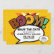 Eine lustige, coole und trendige Retro-Comic-Buch Pop kunstinspiriert Save the Date Einladung, die das Wummis, zap, pow in Ihre Hochzeitsdatum Ankündigung. Auf der Rückseite befindet sich ein passendes Comic-Polka-Punktmuster, das durch ein eigenes Bild oder Foto ersetzt werden kann. Entwickelt von Thisisnotme©