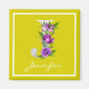Ein traumhaftes Blumengesteck mit kühnen und wunderschönen lila Pfannkuchen und anderen Blume in lila Tönen vermischt sich luxuriös mit den lebhaften grünen Botanicals, die die Blumenarrangements ergänzen. Der personalisierte Name macht es einzigartig und ist ein perfektes Geschenk für jeden Gal, dessen Name mit dem Buchstaben J beginnt. Elegant und modern weiß gerahmt, chartreuse gelben Hintergrund.