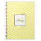 Personalisiertes Spiralnotebook mit einem Zickzack, trendigen, gelben Muster mit individuelle Name in schwarzem handgeschriebenem Schriftart und Monogramm in passendem gelben Farbton in weißem Quadrat.