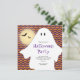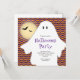 Ghost Halloween-Party Einladung mit einem modernen, orangen, lila und schwarzen Zickzack Muster Hintergrund, zusammen mit einem Mond und Fledermäuse.