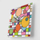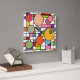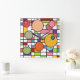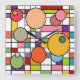 Diese Wanduhr hat ein modernes Design eines Gitters mit ein paar in Retro-Farben eingefärbten Rechtecken und Kreisen darüber.