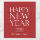 Moderne Typografie "HAPPY NEW YEAR", Starakzent Serif fett in Weiß auf chic roten Farbunterlage. Gerahmtes Jahr und Zeile für Ihren Namen oder Ihre Firma.