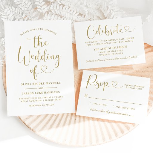 Gold Heart Script Wedding Invitation SuiteDesignt von Kat Fusinski