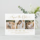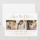 Moderne Hochzeiten in Gold und Weiß sichern die Datumskarten mit einer Collage von drei quadratischen Verlobungen Fotos und einem stilvollen Typografie-Design mit schicken Kalligraphie-Skript und Herzakzenten. Der einfache und elegante, kundenspezifische Text, der mit dem numerischen Hochzeitstermin, den Braut- und Bräutigam-Namen, der Zeremonie-Position, der Hochzeitswebsite und der formellen Einladung zum Nachfassen von Formulierungen vollständig personalisiert werden kann.