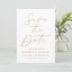 Mit dieser trendigen Modern Gold Script Foto Save the Date Karte verkünden Sie Ihre anstehende Hochzeit im Stil! Das Design zeigt "Save the Date" in trendiger Goldkalligraphie. Personalisieren Sie den Minimalisten Save the Date mit Ihren Namen, Hochzeitstag, Ort und Hochzeitswebsite. Die Einladung kehrt sich um, um Ihr vollblütiges vertikales Verlobung-Foto anzuzeigen. Das schicke Gold Save the Date die perfekte Wahl für moderne Hochzeiten.
