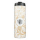 Moderner Imitatgoldstrudel auf Weiß mit vollem Monogramm.