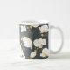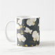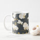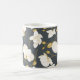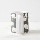 Elegante Tasse mit modernem Blumenmuster mit schönen Orchideen in Gold und Weiß auf dunkelgrauem Hintergrund.