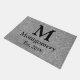 Moderne graue Fischgrätenmusterfußmatte mit schwarzem Monogrammbuchstaben, Familiennamen und hergestelltem Datum.