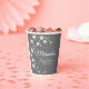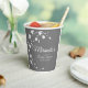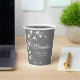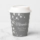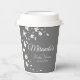 Hübsches und modernes Brautparty-Papier-Becherdesign mit einem Spray aus weißen Blume und weiß anpassbarem Text auf mittlerem grauen Hintergrund