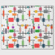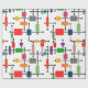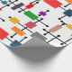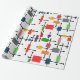 Dieses Verpackungspapier hat eine moderne Mitte des Jahrhunderts ein großes Gitter von horizontalen und vertikalen schwarzen Linien mit farbigen Rechtecken.
