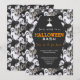 Hexagonal dunkelgraue Sargform und beängstigendes Gespenstermuster mit einem Grabkreuz machen eine moderne, schwarz-weiß-orange Party Einladung und eine einfache Halloween-Bash-Mode. Geeignet für beängstigende lustige Halloween-Party.