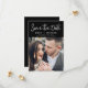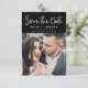 Modernes und elegant handgeschriebenes Script Square Foto Save the Date Wedding Card. Die Save the Date einladende Einladungskarte beinhaltet eine schicke und stilvolle Typografie mit einem einfachen und minimalistischen Design auf schwarzem Hintergrund, mit dem Sie Ihre individuelle Verlobung-Fotografie hinzufügen können.