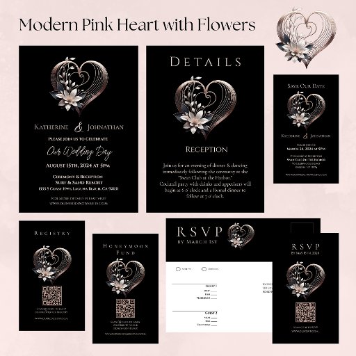Mit dieser modernen Einladung zum Hochzeitsfeiern mit einem rosafarbenen Herzen mit Blume in einem schwarzen Hintergrund stärken Sie Ihre Hochzeit. Dieses zeitgenössische Design verströmt Eleganz und Set für ein stilvolles Fest. Der beeindruckende Kontrast und der elegante Schriftart auf hochwertigem Karton machen diese Einladung zu einem Kunstwerk: Genießen Sie mit dieser luxuriösen und unvergesslichen Ankündigung das Wesen Ihrer Liebe. Bestellen Sie jetzt Ihre Hochzeit mit modernem Charme und zeitloser Eleganz. Feiern Sie mit dieser modernen Hochzeitskollektion den Reichtum Ihrer Liebe in jedem Detail.